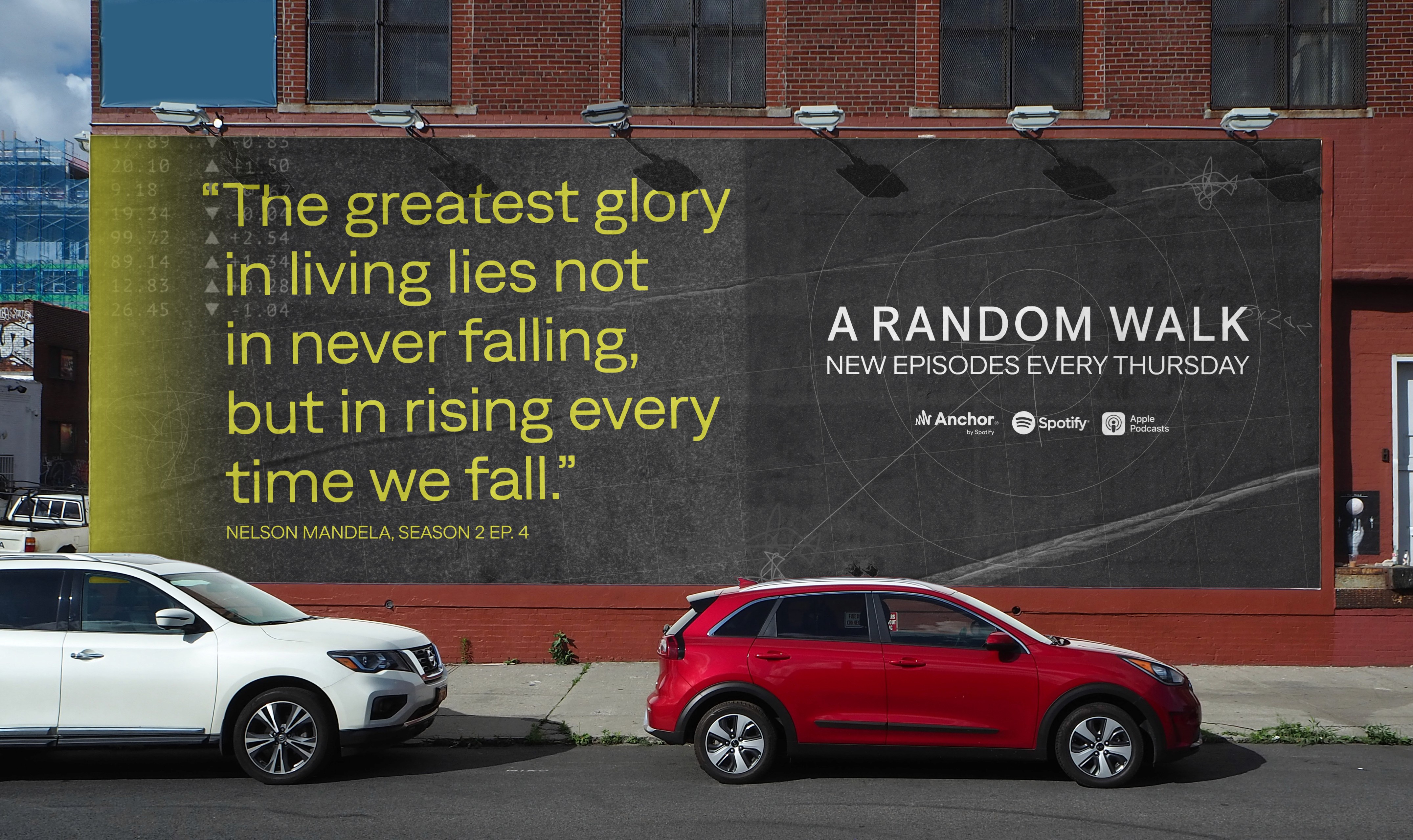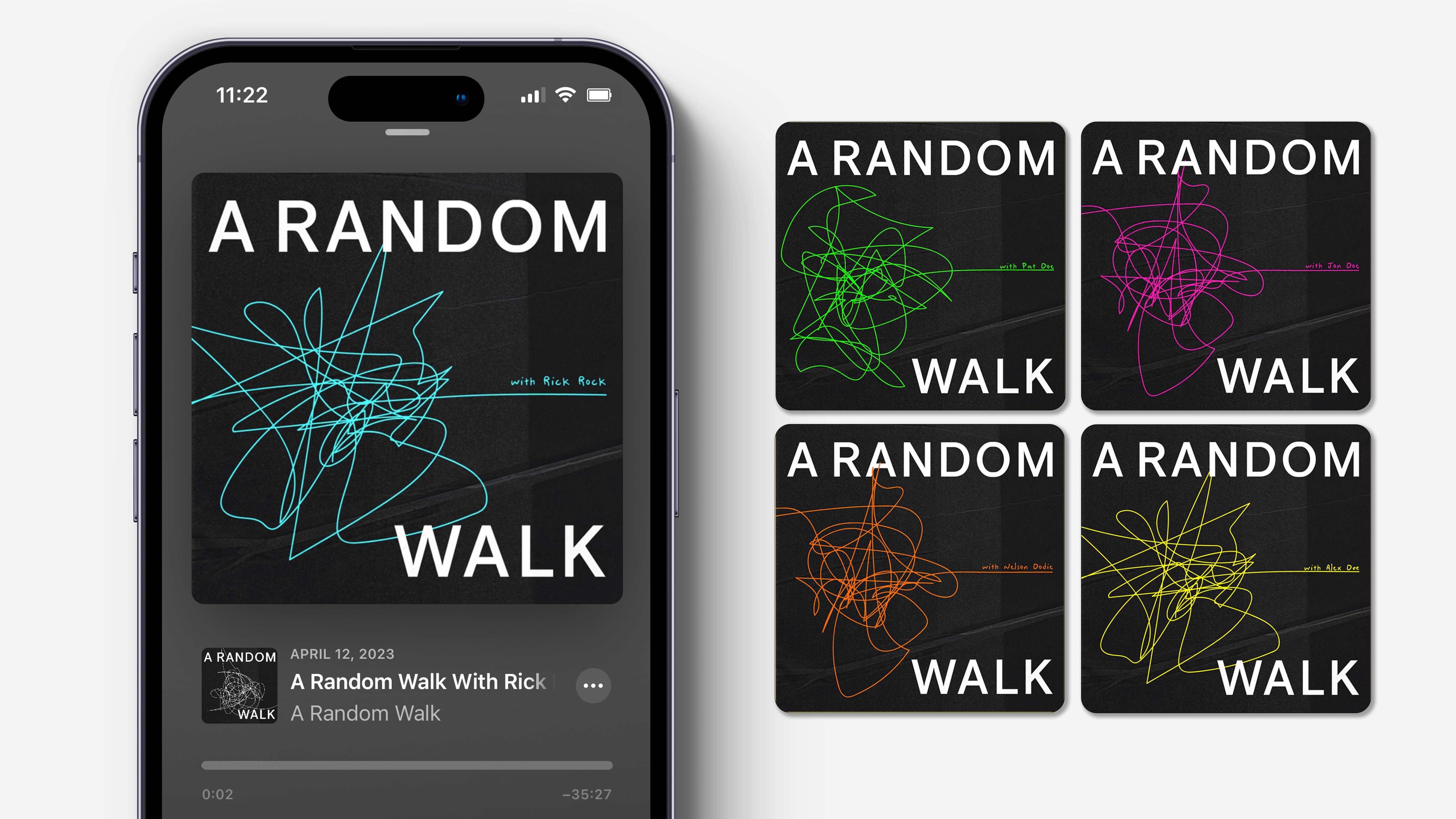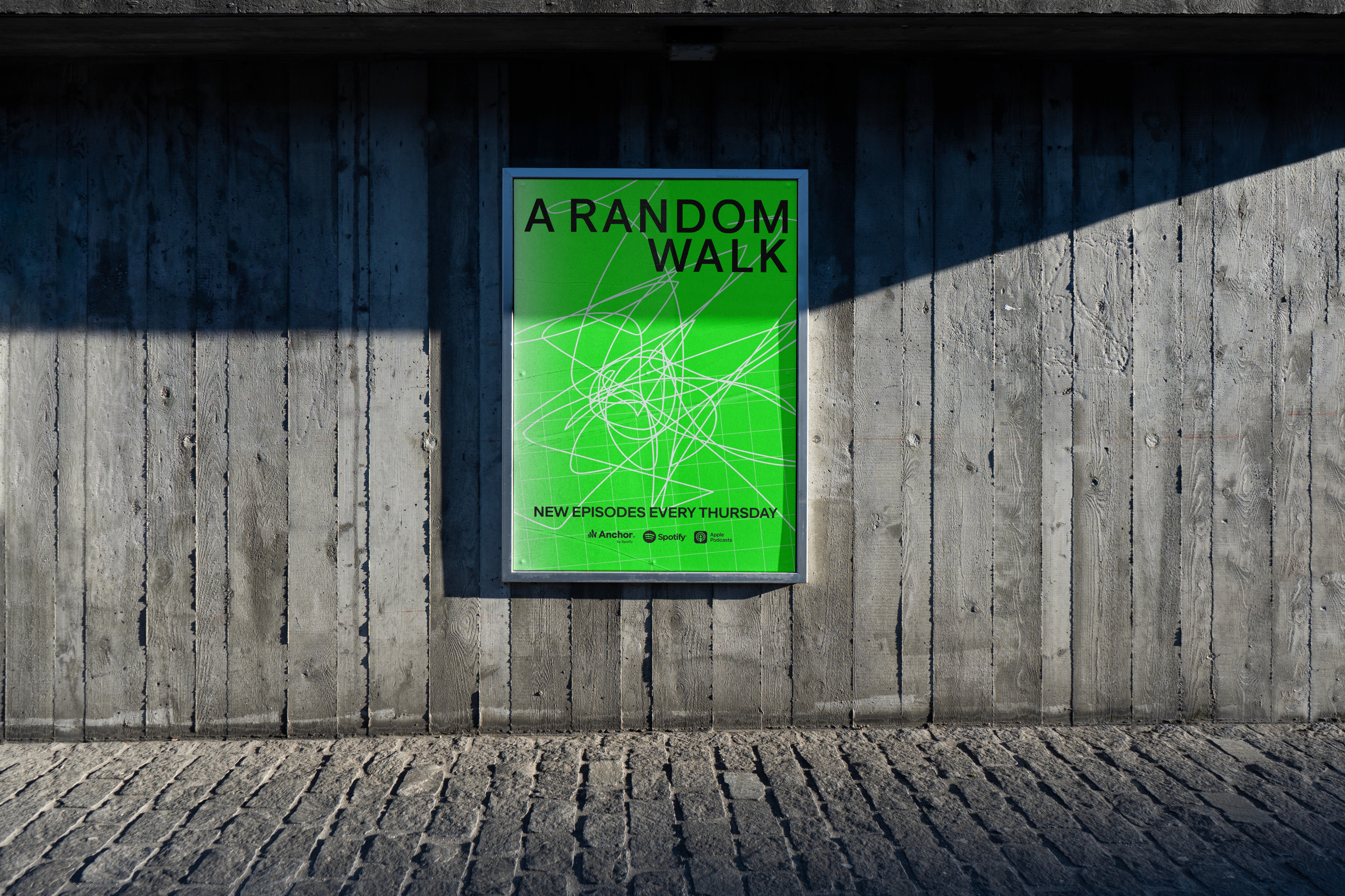 A Random Walk is a podcast exploring the unpredictable paths of ideas, capital, and culture—named after the financial theory that markets follow a “random walk.” I created a flexible identity system inspired by that concept, using abstract, hand-drawn linework to represent nonlinear thinking. The visuals extended across podcast artwork, print, environmental graphics, and digital assets, giving each episode a distinct yet cohesive voice.