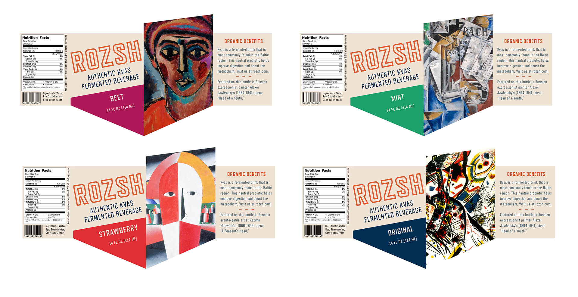 Rozsh is a contemporary beverage brand bringing the traditional Baltic fermented drink kvas to a modern audience. With origins dating back to the Middle Ages, kvas holds deep cultural significance in Eastern Europe and is widely regarded as a national staple in both Russia and Ukraine. The Rozsh brand identity draws from this heritage while reinterpreting it through a modern design lens, incorporating visual influences from Russian art movements ranging from avant-garde to expressionism. The result is a brand that honors the drink’s historical roots while presenting it in a refined, culturally rich, and globally relevant way.