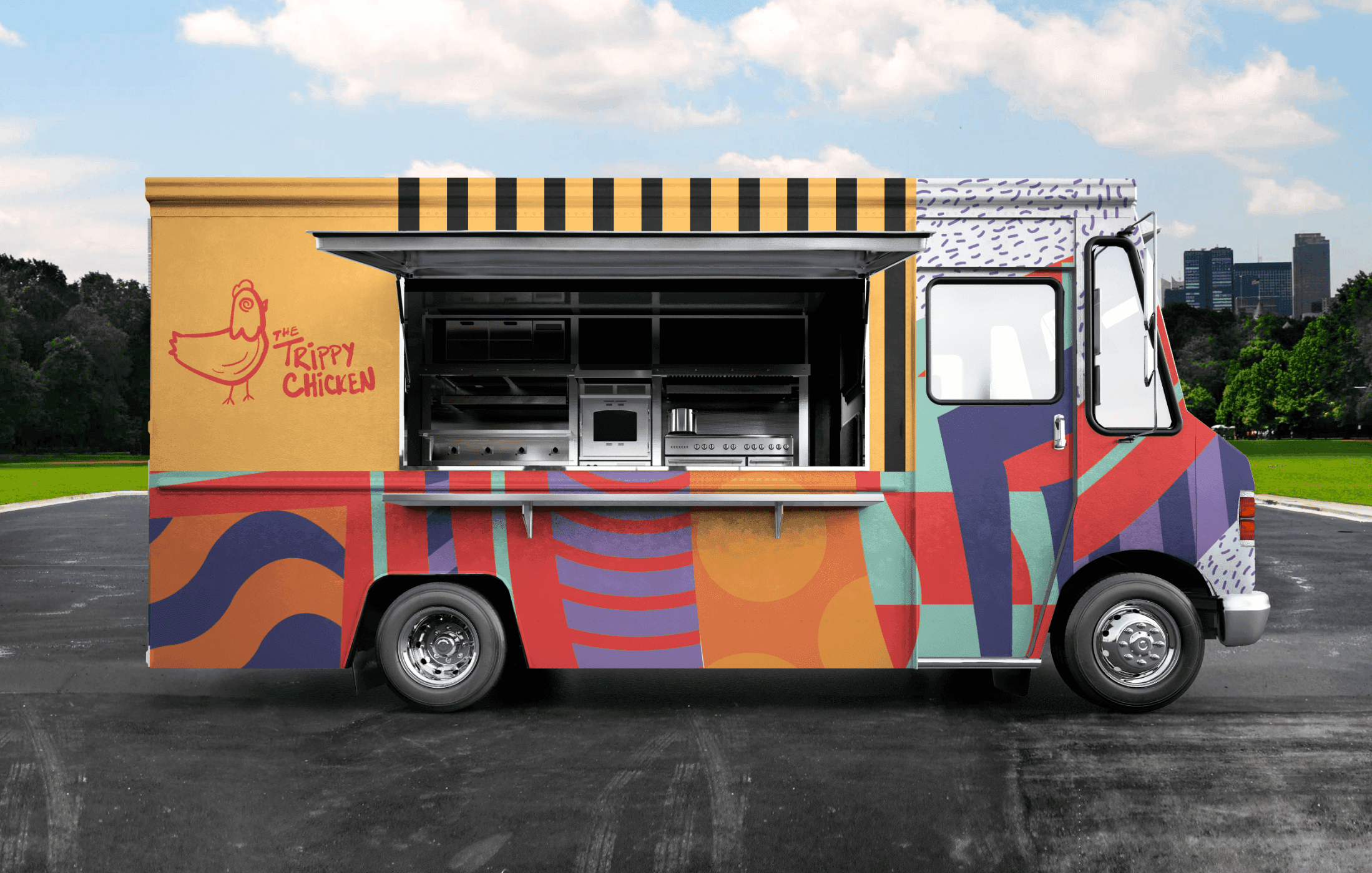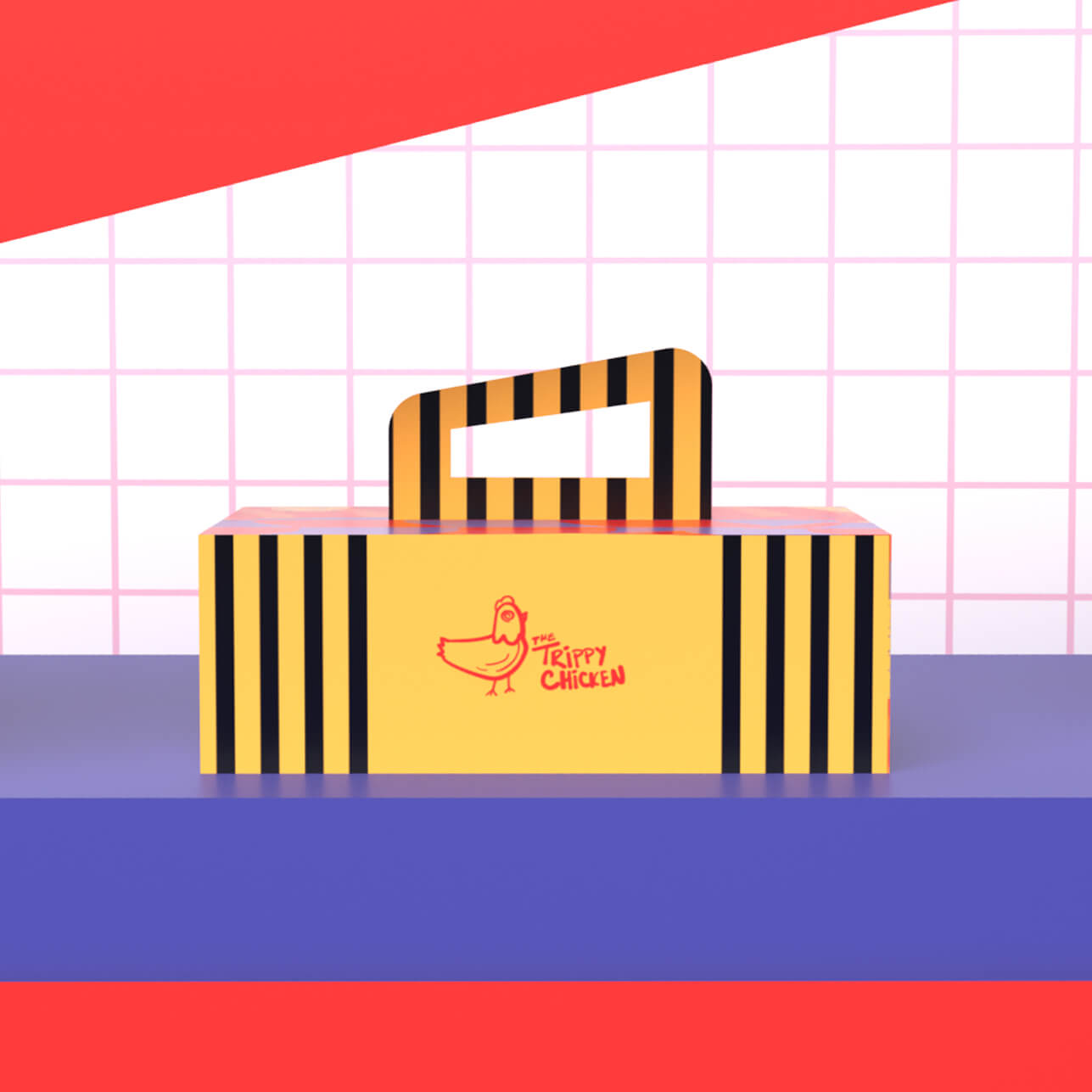 The Trippy Chicken is a conceptual food truck brand that explores how bold, expressive design can coexist with sustainable packaging solutions. Drawing inspiration from ’90s color palettes, German Expressionism, and hand-drawn typography, the brand uses playful, “trippy” visuals to stand out while addressing the environmental impact of traditional takeout materials.
