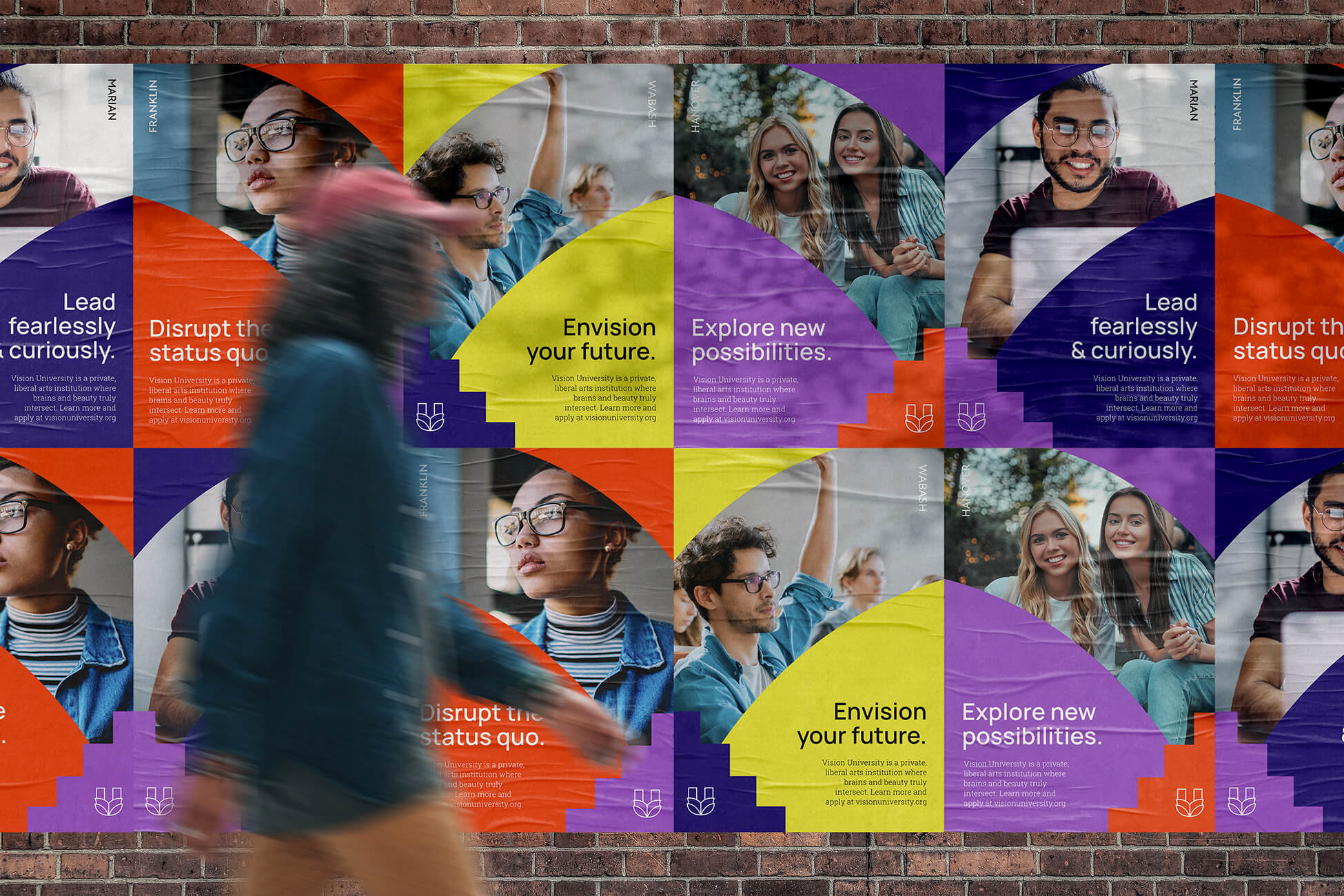 Vision University is a forward-looking higher education brand developed around the unification of four private colleges across the state of Indiana into a single, cohesive institution. The brand is built on the idea of limitless potential—emphasizing building, creating, innovating, and imagining without constraints. This philosophy informs a playful yet intentional visual identity, designed to reflect an academic environment that values creativity, collaboration, and bold thinking while positioning Vision University as a modern, progressive leader in education.
